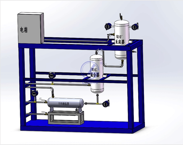 整套裝置由鋼制安裝框架、汽化器、混合器、反應器、仿真儀表、就地計算機操作臺、、就地智能儀表控制上位監控軟件、外置配套設備等組成,工藝路線(xiàn)簡(jiǎn)潔清晰,現場(chǎng)儀表與二次儀表有機結合,上位計算機控制,設置DCS界面及自動(dòng)評分系統。