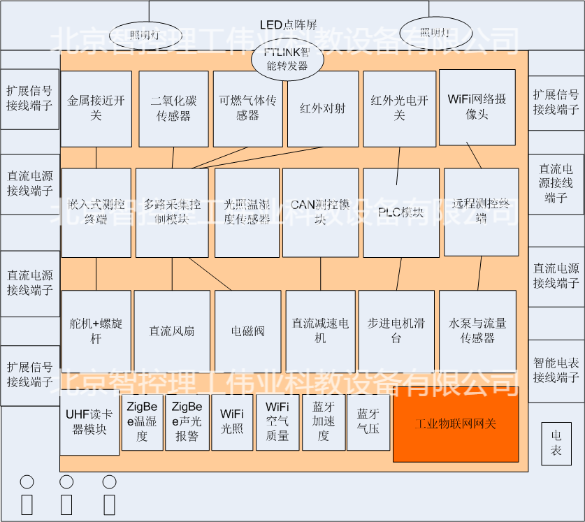 1、標配網(wǎng)孔操作板、四組直流供電板、四組有線(xiàn)傳感器的供電通信板、六個(gè)無(wú)線(xiàn)傳感器節點(diǎn)、一個(gè)工業(yè)物聯(lián)網(wǎng)網(wǎng)關(guān)、兩個(gè)無(wú)線(xiàn)強電控制插座、四種交直流電源按鈕、指示燈、點(diǎn)陣顯示屏等,為行業(yè)應用創(chuàng )新設計提供硬件支持。