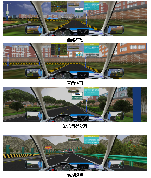 | 道路場(chǎng)景 | 炫目道路:(朝九晚五的太陽(yáng))炫目會(huì )車(chē),炫目駕駛鄉村道路等。泥濘道路:泥濘洼地道路駕駛(方向、制動(dòng)、驅動(dòng)有打滑滯后感)場(chǎng)景模型取鄉村道路,道路變?yōu)槟酀魻顟B(tài)。石子路面:汽車(chē)在其上面行駛,遇到剎車(chē)時(shí)剎不住車(chē),還可汽車(chē)還在繼續滑動(dòng),有時(shí)還會(huì )斜向滑行,極難控制感,汽車(chē)在石子路面里滑動(dòng)。涉水道路:涉水駕駛汽車(chē)有水流沖力對車(chē)輛的前進(jìn)阻力感光及側滑感,輪胎與水下的路壓力減小,驅動(dòng)力受到限制,使行駛受阻感覺(jué)。專(zhuān)項訓練:要附合交通部要求。系統評分:每次駕駛結束,系統自動(dòng)評分。山區到路:突出坡多、彎多、凹凸路面、駕駛環(huán)境復雜、有側風(fēng)、有陡坡長(cháng)坡、溜坡、側滑(有語(yǔ)音提示)。鄉村道路:含鐵道路口;加油站,公交車(chē)站、單行道、農田道口等;城市道路:含公交站臺,高架立交橋、公交專(zhuān)用道、十字路口、丁字路口、環(huán)島、隧道、單行道、雙黃線(xiàn)、加油站、商場(chǎng)百貨門(mén)口斑馬線(xiàn)天橋,學(xué)校門(mén)口及紅綠燈,行人、非機動(dòng)車(chē)亂穿馬路及非機動(dòng)車(chē)等。高速公路:包括收費站(入、停、出、)服務(wù)區、緊急帶、匝道行駛、超車(chē)道、行車(chē)道、隧道、立交橋、交通標牌標線(xiàn)。危險場(chǎng)景:視線(xiàn)不清的交通情況下,超車(chē)后突然切入他人道引起被超車(chē)輛緊急制動(dòng)、自行車(chē)、行人突然橫穿馬路,路面維修,障礙物繞行等 危險場(chǎng)景、 | |