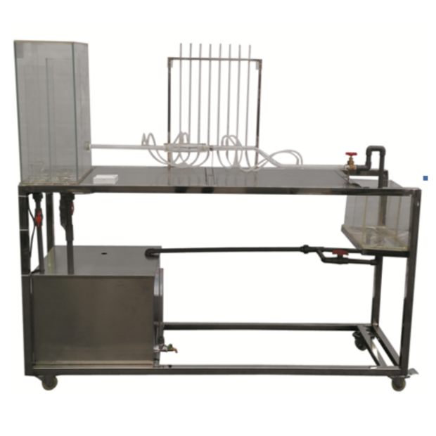 蓄水箱、水泵、有機玻璃實(shí)驗水箱、有機玻璃計量水箱、刻度標尺、秒表、玻璃溫度計、測壓管、閥門(mén)、不銹鋼框架。