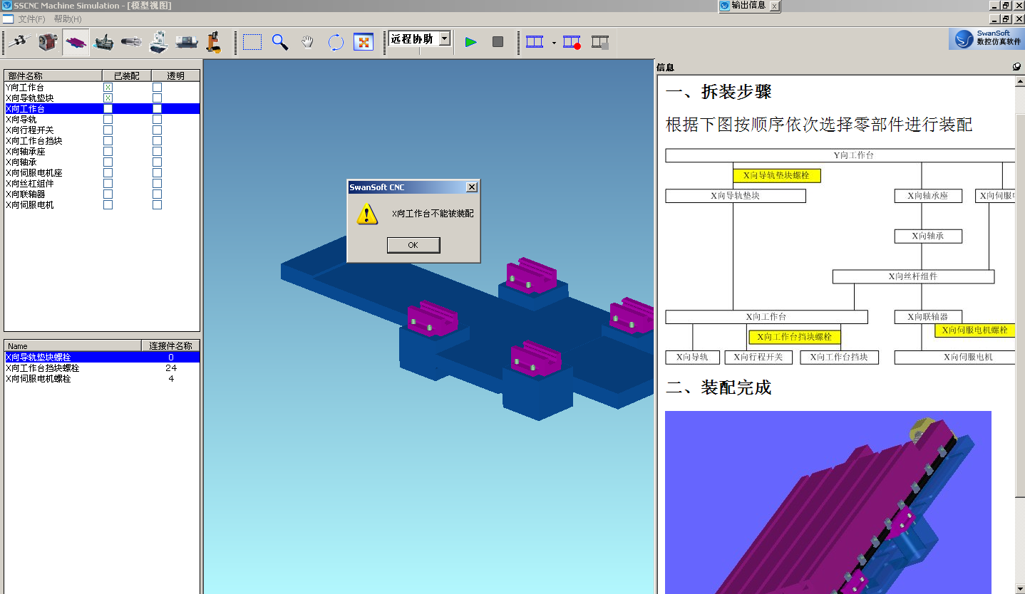 (4)軟件具有平床身、斜床身、加工中心、減速器、齒輪泵的結構拆裝模塊:包括刀庫、主軸系統、十字滑臺、X軸伺服進(jìn)給、Y軸伺服進(jìn)給、Z軸伺服進(jìn)給、加工中心整體、拖板結構、主軸箱、刀架、平床身Z伺服進(jìn)給、平床身整體、斜床身伺服進(jìn)給、斜床身拖板結構、斜床身刀架、斜床身尾座、斜床身整體、減速器整體、視孔蓋、輸出軸、輸入軸、齒輪泵整體部分。拆裝具有示教拆裝和手動(dòng)拆裝功能,同時(shí)提供快速組件裝配和爆炸圖的功能,可以一步裝配好組件也可以從無(wú)到有組裝組件。拆裝過(guò)程提供工藝提示。