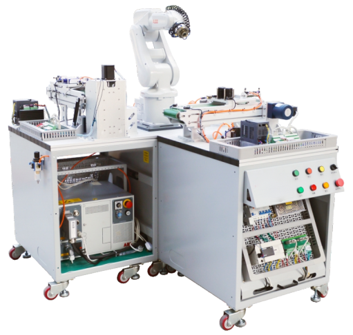 該套設備包含了機器人末端快速換裝法蘭、工業(yè)機器人、步進(jìn)驅動(dòng)器、步進(jìn)電機、可編程邏輯控制器、光纖傳感器、變頻器、三相異步電動(dòng)機等多功能一體化實(shí)訓裝備,裝備分為三個(gè)組合式工作臺,每個(gè)工作臺配備一臺PLC可編程邏輯控制器完成一道既定工序,工作臺與工作臺之間PLC通過(guò)485串口通訊方式進(jìn)行連接。