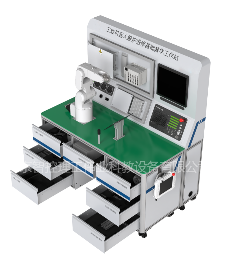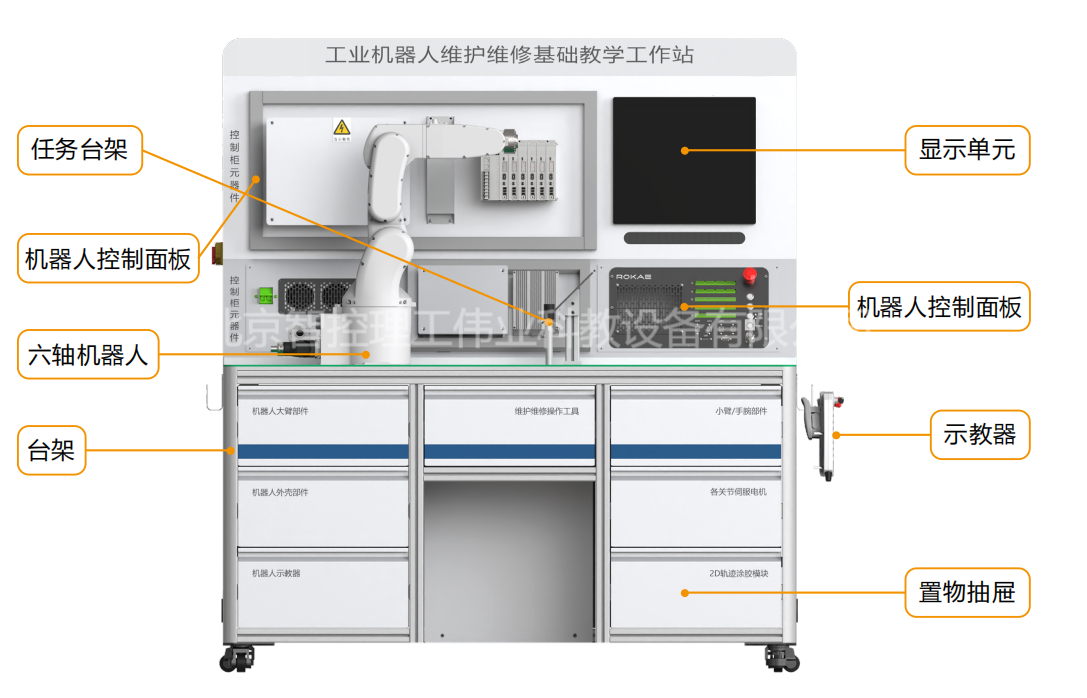 工業(yè)機器人維護維修基礎教學(xué)工作站,以工業(yè)機器人本體及其控制系統最常見(jiàn)維護維修操作為核心,通過(guò)對典型故障的診斷和排除,按照規范步驟完成對工業(yè)機器人本體的拆裝過(guò)程,并根據圖紙要求搭建控制系統并接線(xiàn),由零件級深入了解工業(yè)機器人的構成形式和運動(dòng)方式,掌握基礎維護維修技能。工作站配套了與生產(chǎn)廠(chǎng)家完全相同的工裝、工具,讓學(xué)生可以在教學(xué)環(huán)境中充分體驗高精度機電設備的生產(chǎn)工藝要求,確實(shí)掌握維護維修技能。