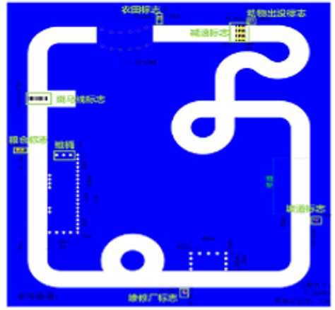 智能汽車(chē)賽道是PVC賽道,有黑白膠帶、藍色背景布、坡道、賽道元素標志、錐桶等。