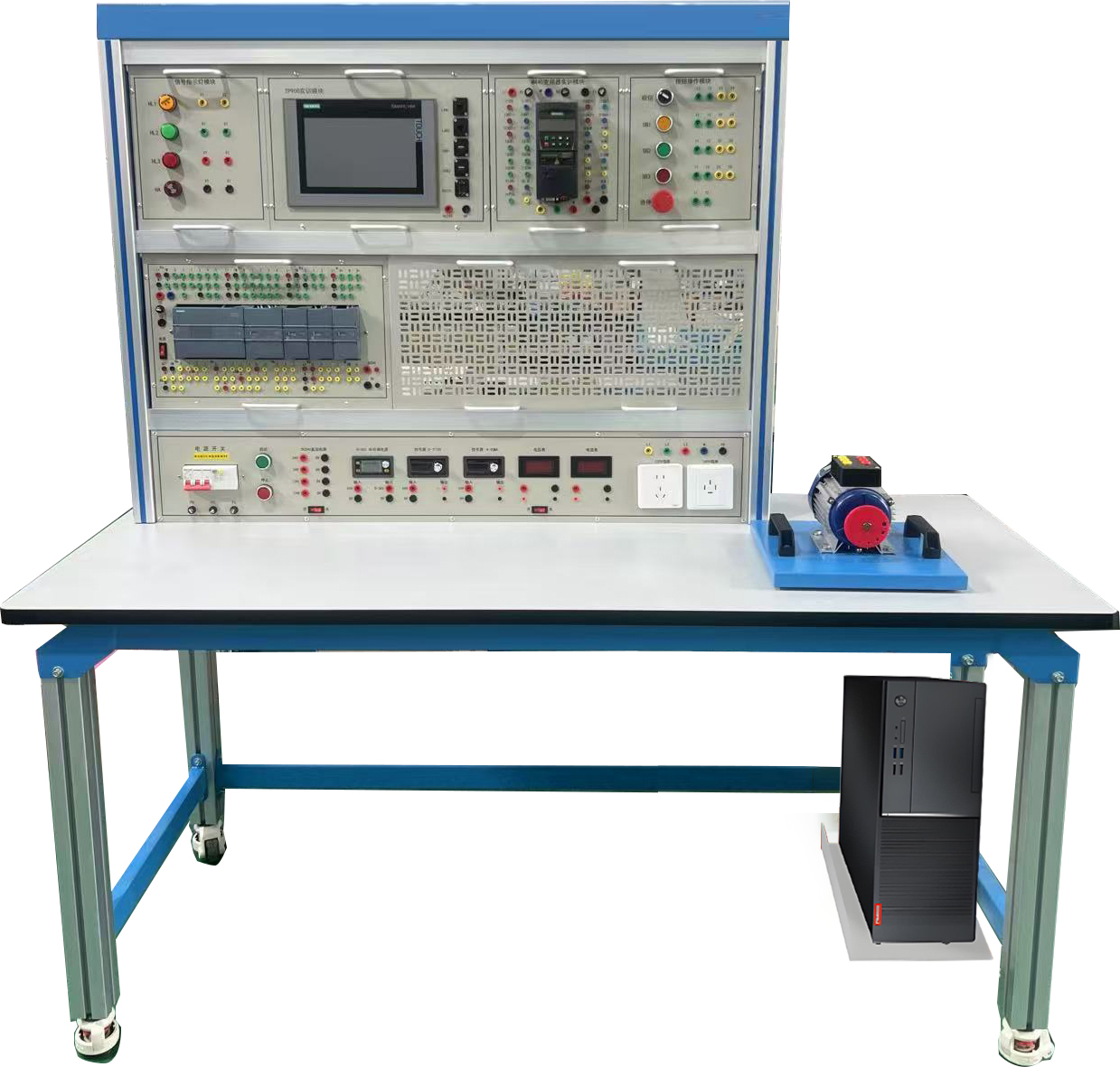 PLC實(shí)驗裝置由控制屏、實(shí)訓桌、主機實(shí)訓組件、實(shí)訓模塊(含豐富的工業(yè)現場(chǎng)設備模擬實(shí)訓對象)、變頻器掛箱、觸摸屏掛箱、交直流電機、總線(xiàn)單元、通信模塊、電機導軌、測速機構等組成。