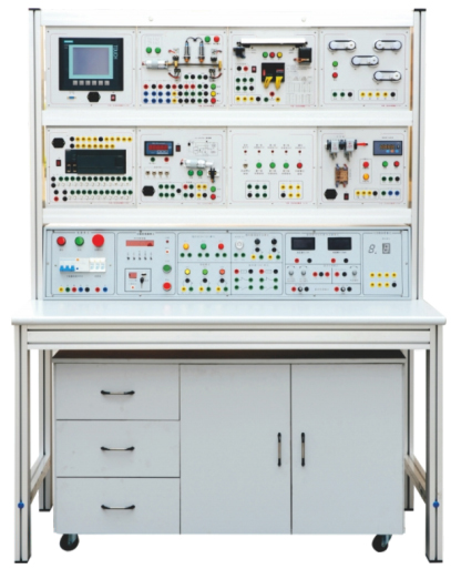 該裝置采用鋁木結構實(shí)訓臺,實(shí)訓臺架由實(shí)訓屏(含電源控制屏)、實(shí)訓桌、實(shí)訓儲物柜三大部分組成。實(shí)訓屏包括電源指示和控制單元、時(shí)間管理器(含電源保護)單元、指示燈和按鈕單元、選擇開(kāi)關(guān)和蜂鳴器及繼電器單元、儀表單元、直流電源單元,電源控制屏的左右兩側分別裝有一個(gè)兩插插座,將外部電源進(jìn)線(xiàn)端裝在電源控制屏的左側(采用航空插連接結構);實(shí)訓屏上部采用三根不銹鋼型材組成通用實(shí)訓模塊固定結構,一次可擺放8個(gè)實(shí)訓模塊,模塊采用標準化結構、互換性強,根據實(shí)訓內容的需要調換實(shí)訓模塊;存儲柜用于存放工具材料及模塊。