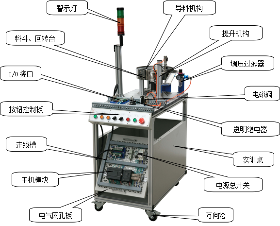由料斗、回轉臺、導料機構、平面推力軸承、工件滑道、提升裝置、檢測工件和顏色識別光電開(kāi)關(guān)、開(kāi)關(guān)電源、可編程序控制器、按鈕、I/O接口板、通訊接口板、電氣網(wǎng)孔板、直流減速電機、電磁閥及氣缸組成,主要完成將工件從回傳上料臺依次送到檢測工位,提升裝置將工件提升并檢測工件顏色。