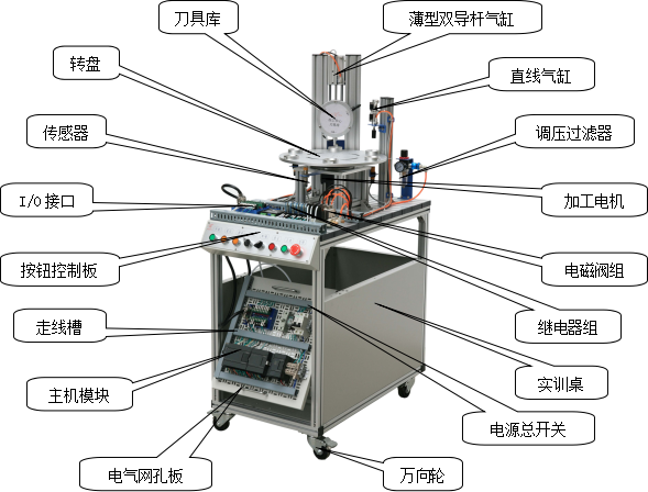 該系統上使用了大量的氣動(dòng)元件,包括多種電控氣動(dòng)閥、多種氣動(dòng)缸、氣動(dòng)夾爪、真空吸盤(pán)、真空發(fā)生器、過(guò)濾減速閥等。在學(xué)習這些氣動(dòng)元件時(shí),不但可以單獨學(xué)習每一種分離元件,而且還可以在學(xué)習時(shí)了解各種氣動(dòng)元件之間,以及氣動(dòng)元件與其它元件之間,如何配合起來(lái)并協(xié)調進(jìn)行工作的。