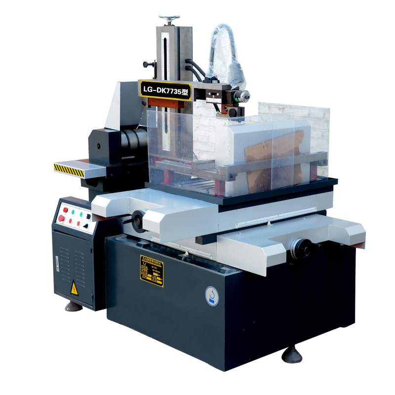 LG-DK7735型 數控線(xiàn)切割機床可用于加工點(diǎn)、直線(xiàn)、圓弧組成的各種復雜形狀的金屬零件,本機床采用鉬絲作為工具,電極在高頻脈沖電壓作用下,利用液體介質(zhì)被擊穿后形成火花放電時(shí),在火花通道中瞬間產(chǎn)生大量的熱量,使工件表面的金屬部溶化甚至氣化,使金屬被蝕除下來(lái)。本機床操作簡(jiǎn)便,加工效率高,穩定可靠,經(jīng)濟耐用,可廣泛用于儀器、儀表、汽車(chē)行業(yè)模具制造,加工各種沖模、靠模、樣板及異形零件。