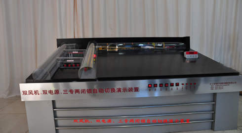 該雙風(fēng)機、雙電源、自動(dòng)切換,三專(zhuān)二閉鎖演示裝置(適合于一、二、三、四級),通過(guò)聲光機械控制技術(shù),顯示出了井下局部通風(fēng)機雙風(fēng)機、雙電源、自動(dòng)切換、三專(zhuān)二閉鎖系統的布置,運行方式。