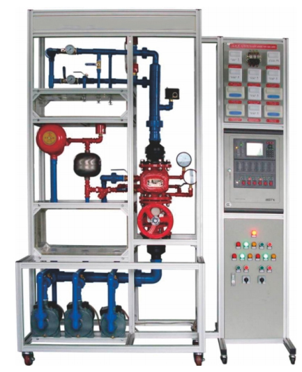 本裝置采用高級鋁型材框架開(kāi)放式結構設計,主要由濕式報警閥、信號閘閥、水力警鈴、水延遲器、各類(lèi)噴淋頭、增壓泵、恒壓泵、壓力開(kāi)關(guān)、水流指示器、壓力表、末端試水裝置、透明有機玻璃水箱、水泵控制箱、火災報警控制器、聯(lián)動(dòng)控制模塊、基于BACnet總線(xiàn)網(wǎng)絡(luò )的DDC控制器、手閥及各類(lèi)水管等組成。