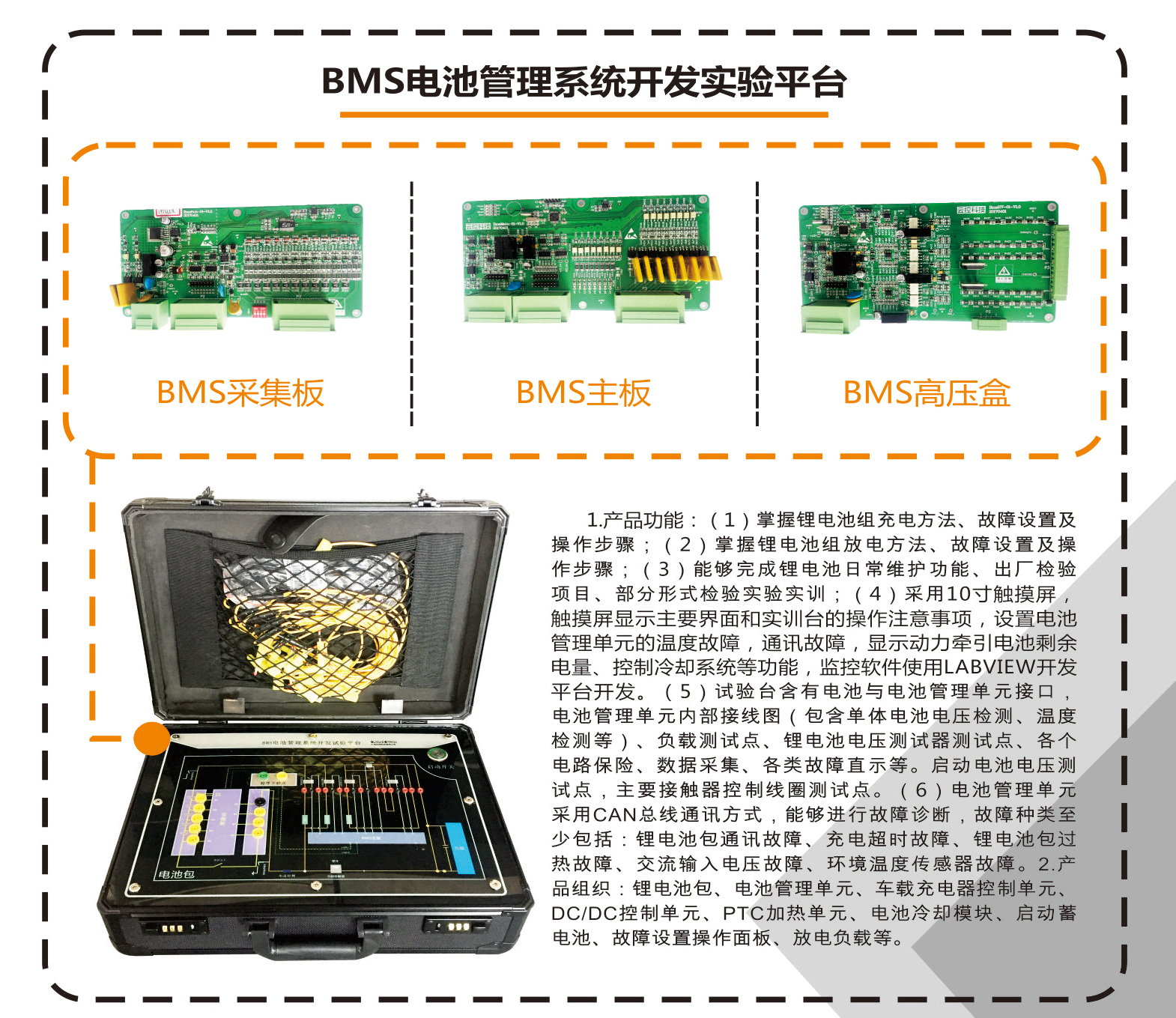 LGE-XD06型 新能源汽車(chē)BMS電池管理系統開(kāi)發(fā)實(shí)驗平臺采用高性能嵌入式數字電池電路板,故障模擬板,ARM核心主控板,車(chē)用磷酸鐵鋰動(dòng)力電池,臺架動(dòng)力電池組采用24節單體電池串聯(lián)組成;備有實(shí)驗連接線(xiàn)和實(shí)驗指導書(shū)等。為學(xué)生提供了一個(gè)進(jìn)行綜合應用、創(chuàng )新實(shí)訓,可充分發(fā)揮學(xué)生潛能的完全開(kāi)放的平臺。