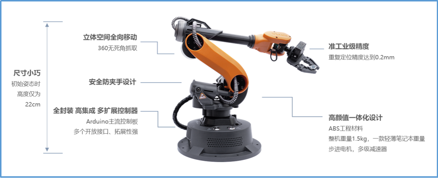 1、六軸桌面機械臂(含電源、USB接線(xiàn)、IDC通訊線(xiàn)、機械夾爪、筆夾、多功能控制器、使用說(shuō)明書(shū))×1