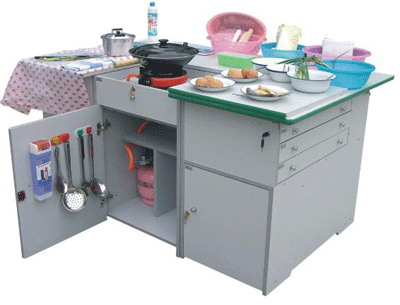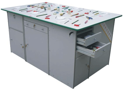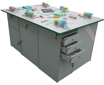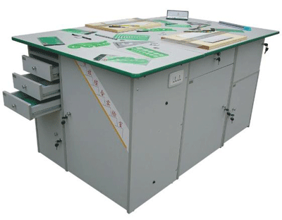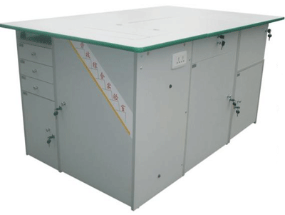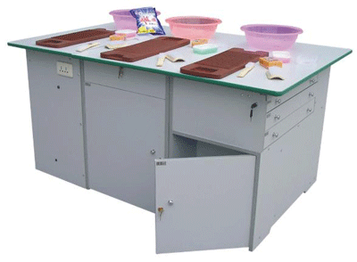 功能:桌體材料選用16mm厚優(yōu)質(zhì)雙貼面三聚氰胺板和30mm×30mm角鋼組成,桌體板截面選用優(yōu)質(zhì)PVC封邊經(jīng)全自動(dòng)封邊機加溫180攝氏度膠封。桌面材料選用(A型)18mm厚優(yōu)質(zhì)雙貼面三聚氰胺板或(B型)25mm后成型防火貼面密度板,桌面板截面選用綠色T型PVC封邊槽封。桌體設計由三獨立單元組合在一起,例如金工、木工、洗滌為A獨立單元,烹飪、電工與電子為B獨立單元,縫紉與裁剪、手工工藝為C獨立單元。如果A獨立單元或B獨立單元單獨操作時(shí),桌面可翻轉自如,而且各獨立單元的配備都儲放在各自獨立單元桌體里面。