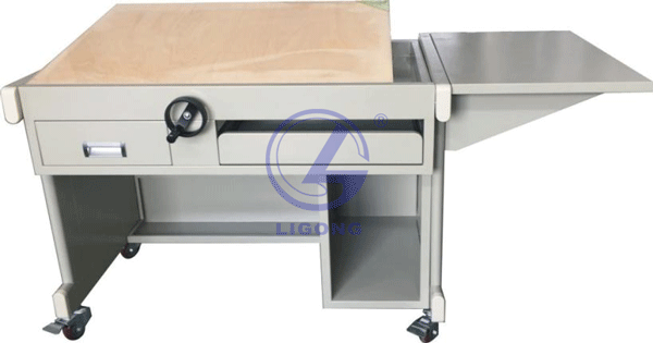 桌面可調節傾角、桌子側面折疊板翻開(kāi)可放置儀器、工具,下面抽屜供放學(xué)習資料、工具書(shū)等。