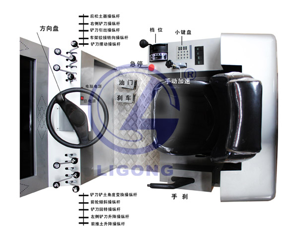 3.擁有腳踏、操縱箱、方向機、檔位控制器、油門(mén)踏板、松土器、手剎、轉向燈、高集成數據電路板及各種功能調節組件等組成,操作時(shí)在視屏上顯示輸出與操作相對應的逼真三維場(chǎng)景并伴有相應語(yǔ)音提示;