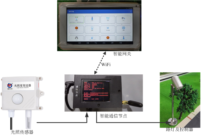 (1)路燈控制系統:由智能通信節點(diǎn)及外圍驅動(dòng)電路板、路燈、光照傳感器組成。智能通信節點(diǎn)實(shí)時(shí)采集光照度,通過(guò)無(wú)線(xiàn)通信方式傳輸至網(wǎng)關(guān)。結合網(wǎng)關(guān)應用程序,可以實(shí)現路燈開(kāi)關(guān)控制、環(huán)境光照度定時(shí)采集,設置光照傳感器與路燈控制器的聯(lián)動(dòng)策略,根據光照強度,自動(dòng)控制路燈開(kāi)關(guān);同時(shí)將光照度數據、路燈開(kāi)關(guān)狀態(tài)上傳到云平臺進(jìn)行可視化展示,遠程路燈控制。
