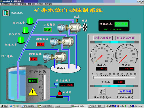 3. 具有完善的報警系統,能逼真的模擬工業(yè)現場(chǎng)的各種情況,如礦井液位、泵轉速及電機溫度的檢測信號故障報警,低水位、高水位以及超高水位的聲光同步報警、優(yōu)先級報警,報警復位和報警禁止復位等功能