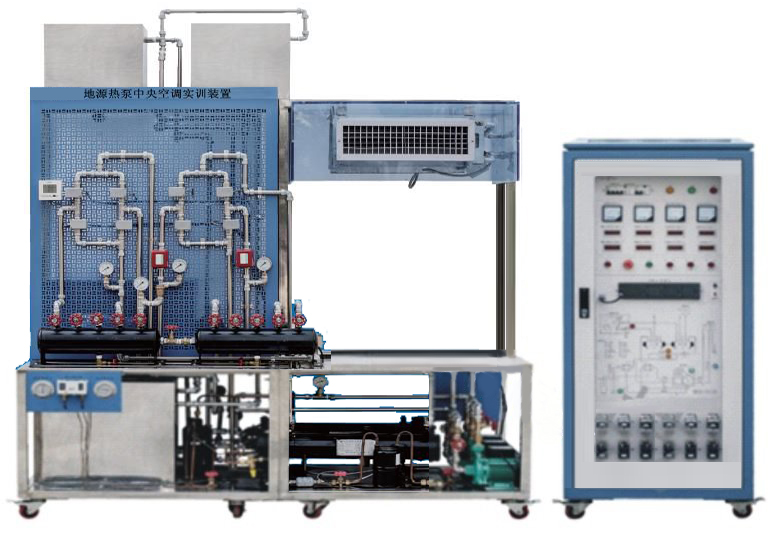 地源熱泵空調系統由制冷機組、模擬水井、空調系統、生活衛生供水系統、控制系統、實(shí)訓臺等組成。實(shí)訓臺采用不銹鋼底架結構,結構堅固,造型美觀(guān)大方;桌面用于安裝電源控制屏并提供一個(gè)寬敞舒適的工作臺面。