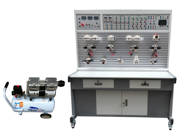 1、液壓與氣壓傳動(dòng)PLC控制綜合實(shí)訓裝置由實(shí)訓臺、實(shí)訓桌、電源模塊、PLC電氣控制模塊、繼電器控制模塊、控制按鈕模塊、時(shí)間繼電器模塊、液壓泵站、液壓元件、氣泵、氣動(dòng)元件等組成。
