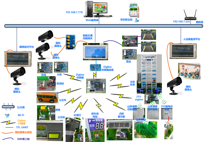 智能交通應用實(shí)訓系統以城市道路交通為原型,融合了無(wú)線(xiàn)傳感器網(wǎng)絡(luò )、RFID射頻識別、圖像識別、無(wú)線(xiàn)通信、云服務(wù)、M2M中間件等物聯(lián)網(wǎng)先進(jìn)技術(shù),依托部署在交通沙盤(pán)中的智能車(chē)、紅綠燈、公交站、RFID設備、模擬攝像機、網(wǎng)絡(luò )攝像機、Android網(wǎng)關(guān)、圖像服務(wù)器等設備,實(shí)現智能車(chē)、紅綠燈控制、公交站自動(dòng)播報、路燈控制、智能停車(chē)場(chǎng)、違章抓拍、車(chē)牌識別、人流量檢測、公路災害智能預警等功能,為物聯(lián)網(wǎng)專(zhuān)業(yè)教學(xué)提供了一個(gè)完備的應用實(shí)訓系統。