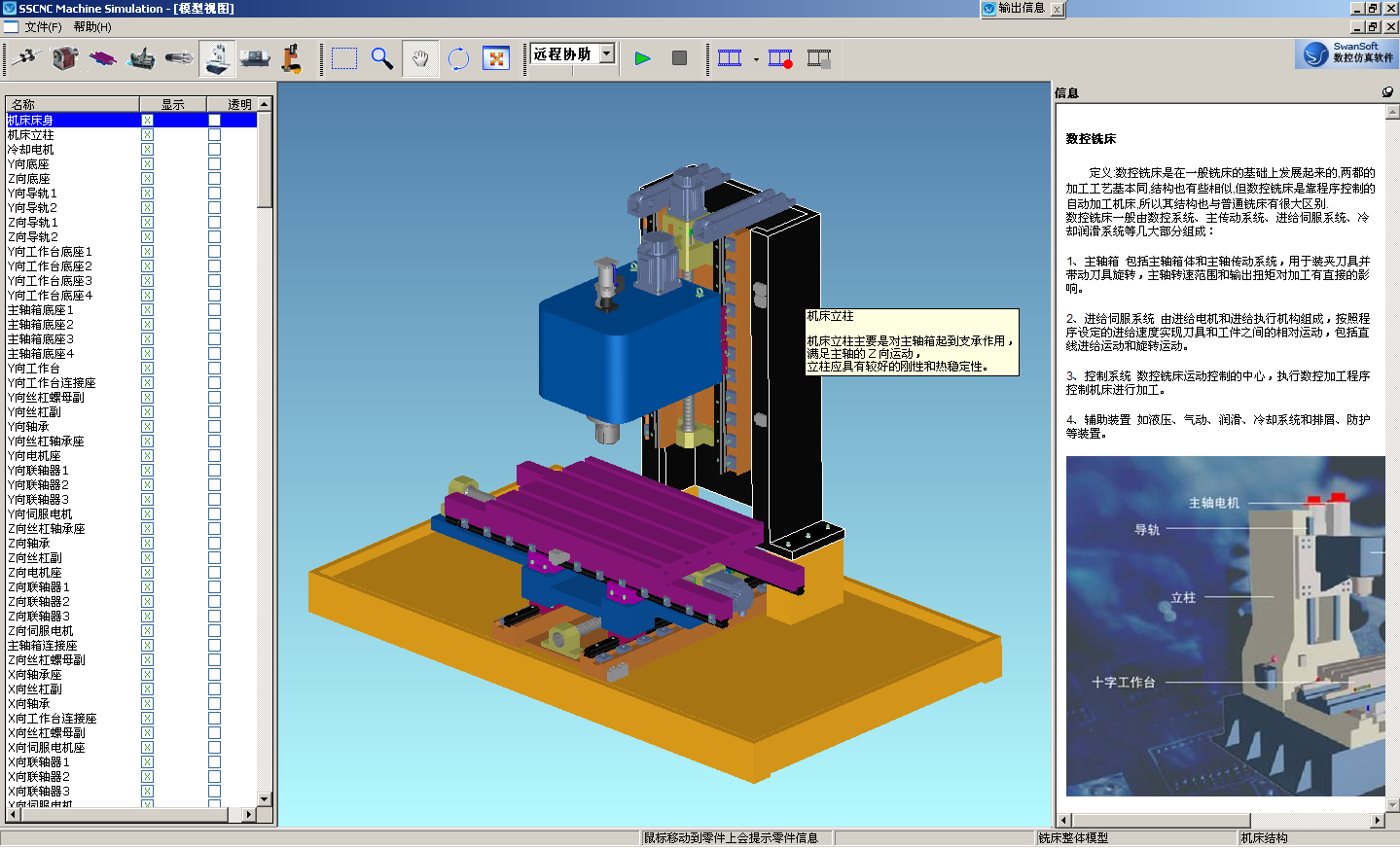 (2) 軟件具有數控車(chē)床和銑床的機械結構展示(要求做到每一個(gè)機械部件)的3D顯示。銑床包括整機結構、主軸箱總成、伺服總成、絲桿連接總成、Z軸總成等。
