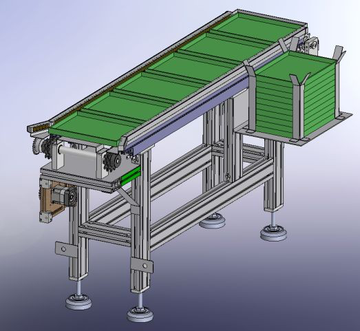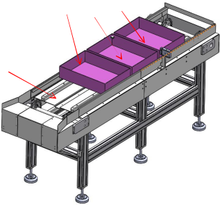 物品盒流水線(xiàn)采用板鏈結構,負責成品物品盒的裝箱及傳送,為5工位流水線(xiàn),裝在3個(gè)物品盒(占用3個(gè)工位)。