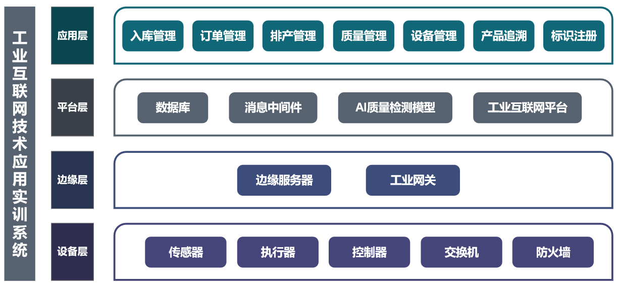 工業(yè)互聯(lián)網(wǎng)技術(shù)應用實(shí)訓臺采用四層架構,從底到頂依次為設備層、邊緣層、平臺層、應用層。