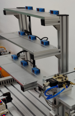 3、立體倉庫:存儲自動(dòng)裝配工件;倉位數量:≥3列3層9個(gè);倉位承重:≥2Kg;倉位尺寸:≥100mm×70mm×80mm;外形尺寸:≥350mm×180mm×450mm;工件種類(lèi):≥3種9個(gè);工件模塊包括自動(dòng)裝配母件、子件等。