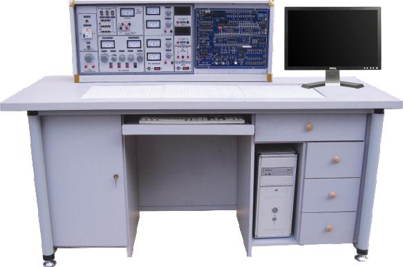 一桌為二座,桌面中央設置通用電路插板,元件盒在其上接插成實(shí)驗電路完成實(shí)驗。桌子左右各有一個(gè)柜,柜中存放元器件、貯存板及電腦,中間上層放置鍵盤(pán)、