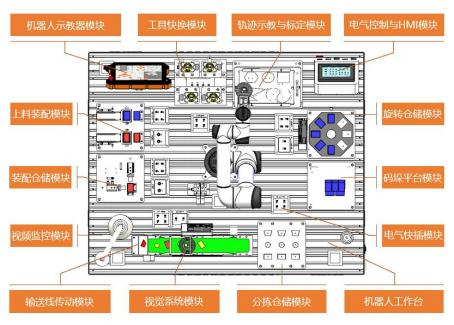 工作臺整體由兩個(gè)基礎臺拼接而成,更具空間靈活,拆卸方便等特點(diǎn)。臺面采用標準鋁型材,機器人 及功能模塊可根據需求改變布局位置,所有功能模塊采用手擰螺栓方式固定,可實(shí)現無(wú)工具快速拆裝與更 換。每個(gè)模塊電氣部分配置了獨立的電氣接線(xiàn)盒和快速航插,可實(shí)現模塊整體機械和電氣快速安裝部署, 還可根據需求更換或添加功能模塊進(jìn)行功能擴展。