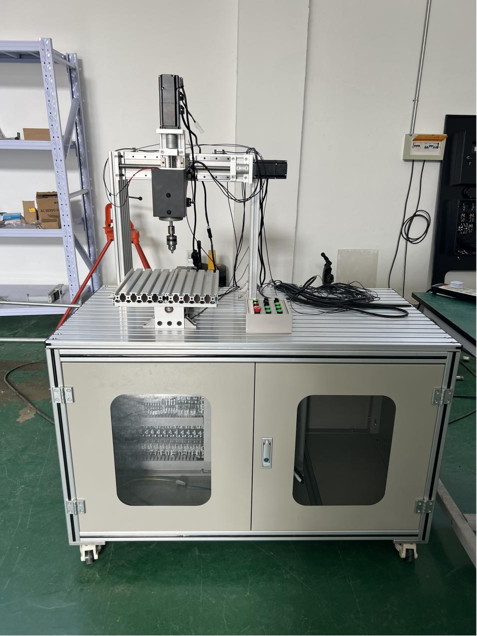 4、實(shí)訓裝置雕刻機部分的實(shí)訓桌面及其支撐腳、 電控柜主體框架全部采用優(yōu)質(zhì)標準鋁型材加工制作,機械強度好、重量輕、美觀(guān)大方,持久耐用。