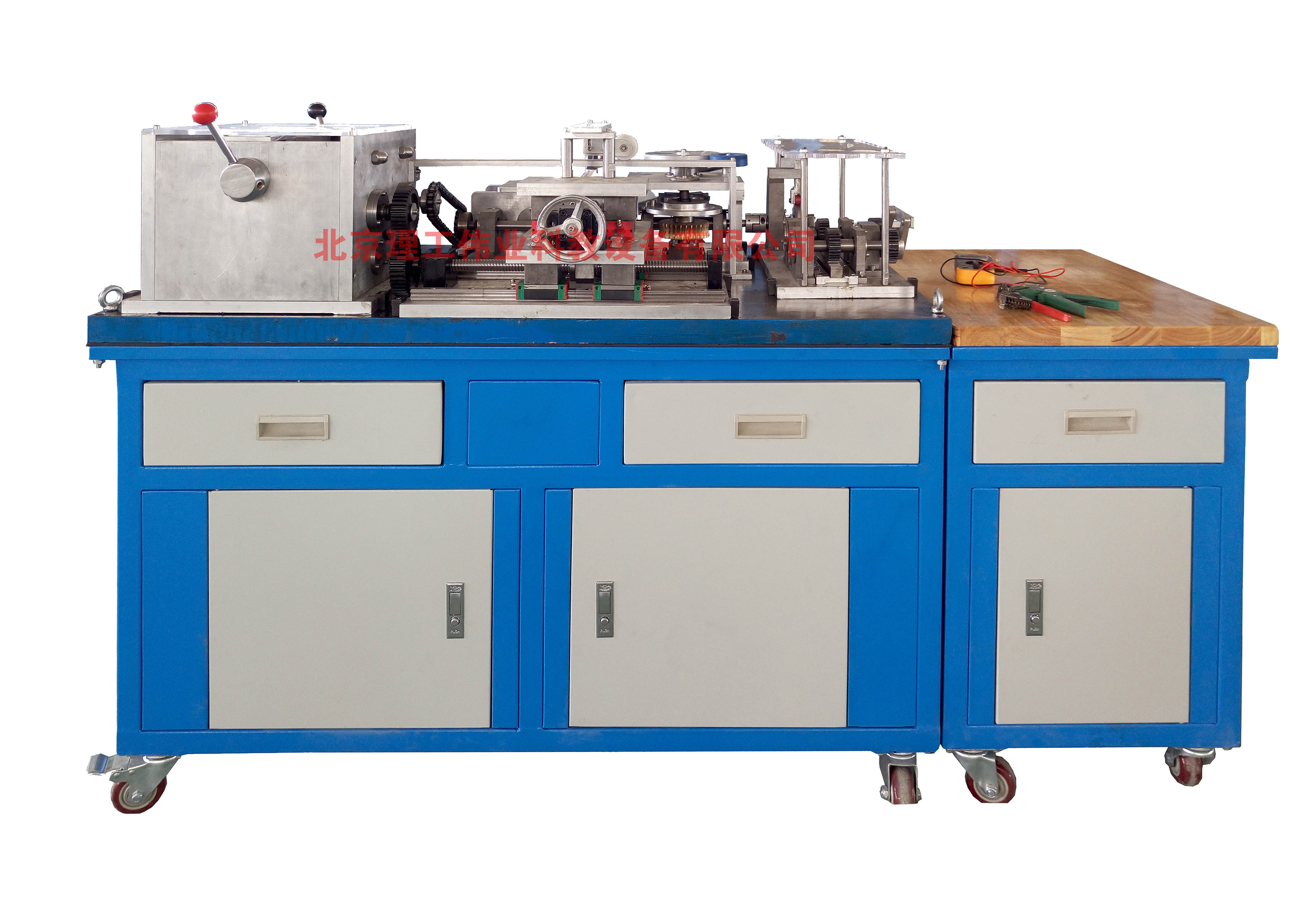 LG-JXZT01A型 機械裝調技術(shù)綜合實(shí)訓裝置主要由多種機械模塊組成,各個(gè)模塊可獨立訓練,也可綜合訓練。模塊包括(動(dòng)力源、齒輪箱、十字滑臺、沖壓回轉工作臺、二級變速器、離合器、摩擦輪機構、曲柄及凸輪組合機構等)。涉及各種機械設備裝配中的一些比較典型的技能點(diǎn)和知識點(diǎn)。比如:帶、鏈等傳動(dòng)機構的裝配與調整、齒輪箱的裝配、沖壓設備的裝配、軸承的裝配與調整(深溝球軸承、角接觸軸承、圓錐滾子軸承、推力球軸承)、圓柱圓錐齒輪的裝配與調整、蝸輪蝸桿副的裝配、齒條的裝配、曲柄及凸輪副的裝配與調整、槽輪及摩擦輪的裝配、摩擦輪與滾道裝配、滾珠絲桿副裝配、直線(xiàn)導軌的裝配與調整、相關(guān)平行度及垂直度的調整與檢測等。