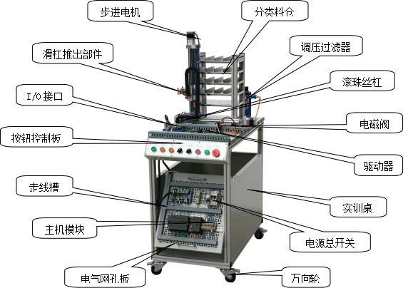 由滾珠絲杠、滑桿推出部件、分類(lèi)料倉、步進(jìn)電機、步進(jìn)驅動(dòng)器、電感傳感器、開(kāi)關(guān)電源、可編程序控制器、按鈕、I/O接口板、通訊接口板、電氣網(wǎng)孔板、多種類(lèi)型電磁閥及氣缸組成,主要完成按工件類(lèi)型分類(lèi),將工件推入料倉。