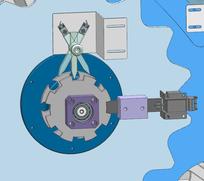 防逆轉裝置如下圖,裝置裝在扶梯上部驅動(dòng)位。在扶梯上行時(shí)凸輪順時(shí)針轉動(dòng),若扶梯發(fā)生異常情況而逆轉則凸輪逆轉,此時(shí)打桿使限位開(kāi)關(guān)動(dòng)作并使扶梯主剎動(dòng)作從而使扶梯停止,反之亦然。同時(shí)此功能具備手動(dòng)測試操作功能。