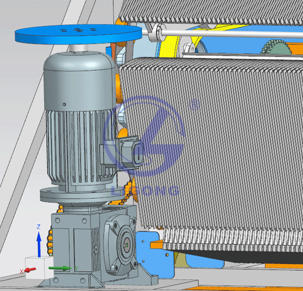 由交流電機、專(zhuān)用減速器、制動(dòng)器、手動(dòng)盤(pán)車(chē)和傳動(dòng)齒輪等組成。